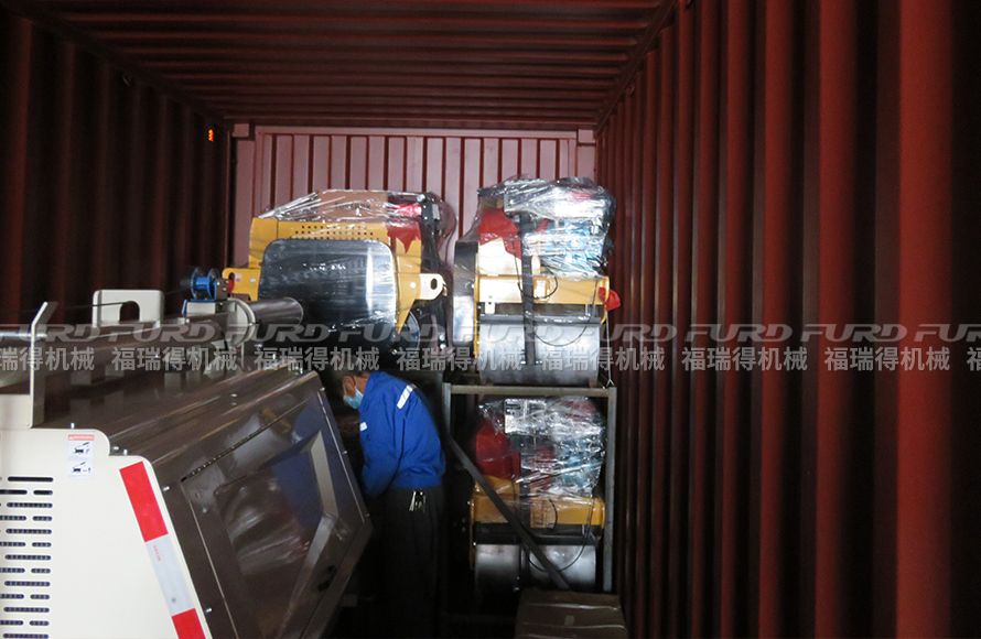 机械6台手扶双轮压路机、和2台9米移动灯车装车出口非洲。