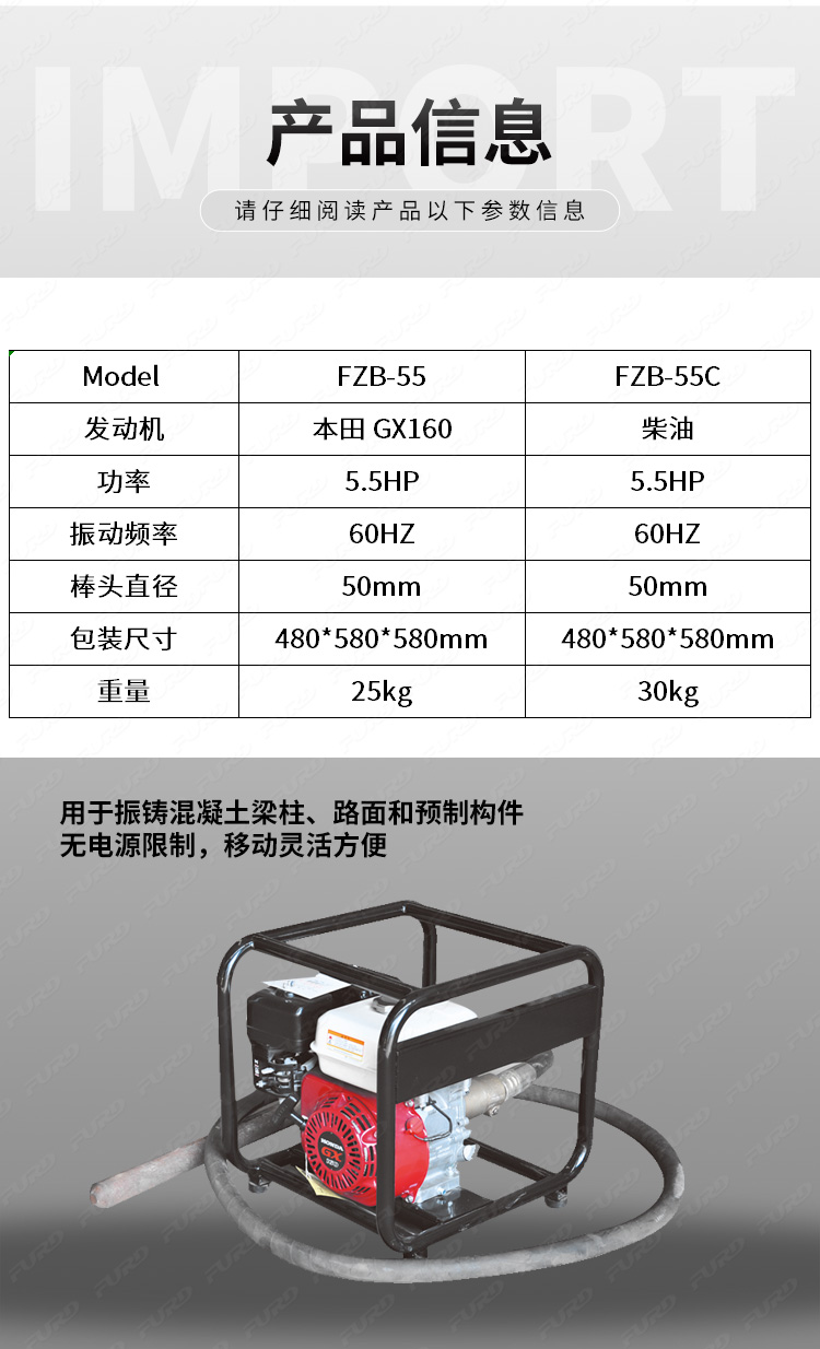 用于振铸混凝土梁柱、路面和预制构件。 无电源限制,移动灵活方便。