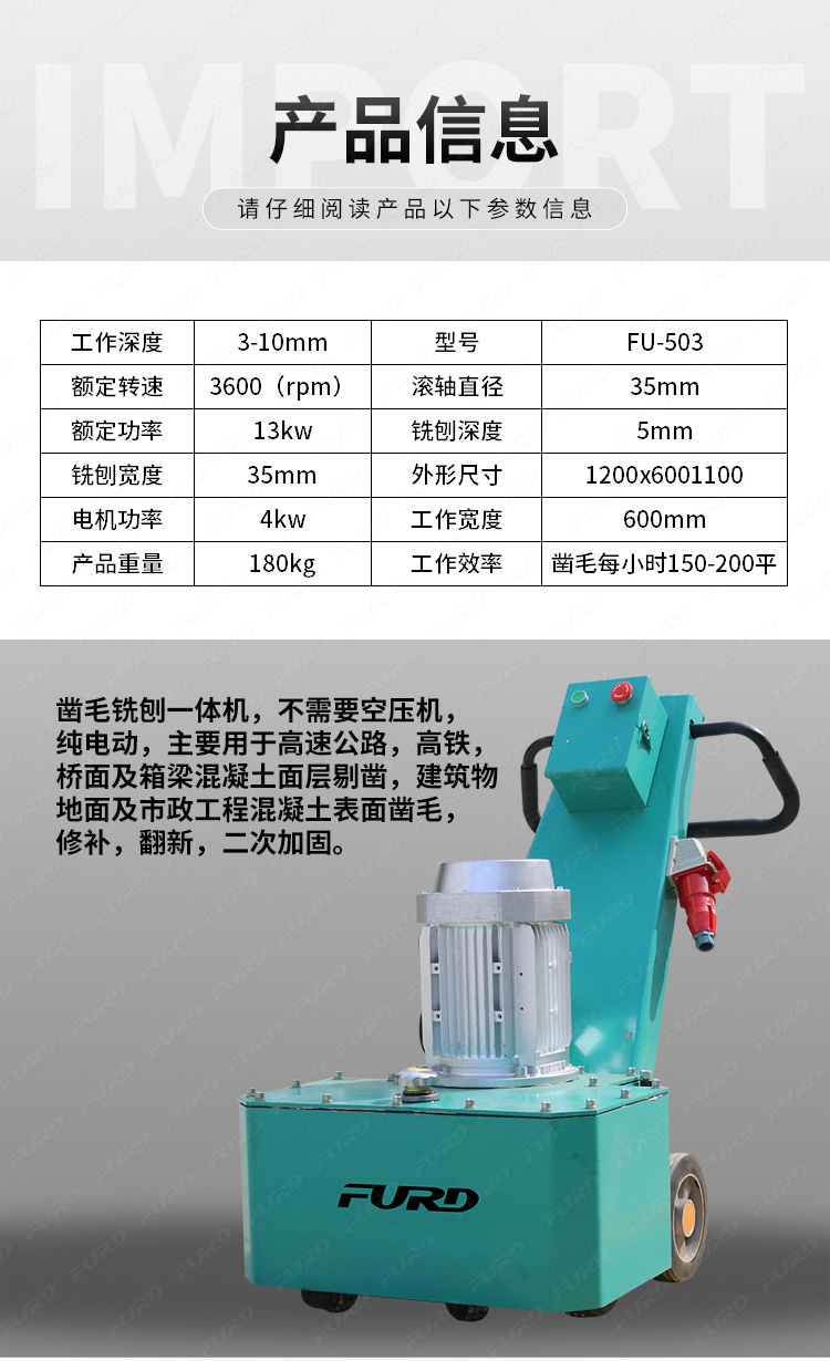 铣刨凿毛一体机同时具备了铣刨机和凿毛机这两个机器设备的功能,不但效率高而且为您节省费用,提高工作效率!该机器可以用于高速公路、高铁、桥面及箱梁混凝土层剔凿,建筑物地面及市政工程混凝土表面凿毛、修补、翻新、二次加固。