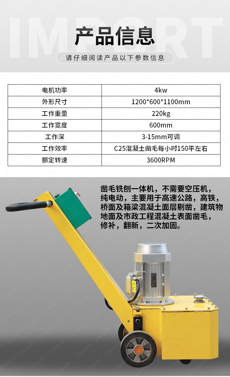 凿毛铣刨一体机,不需要空压机,纯电动,主要用于高速公路,高铁,桥面及箱梁混凝土面层剔凿,建筑物地面及市政工程混凝土表面凿毛,修补,翻新,二次加固。