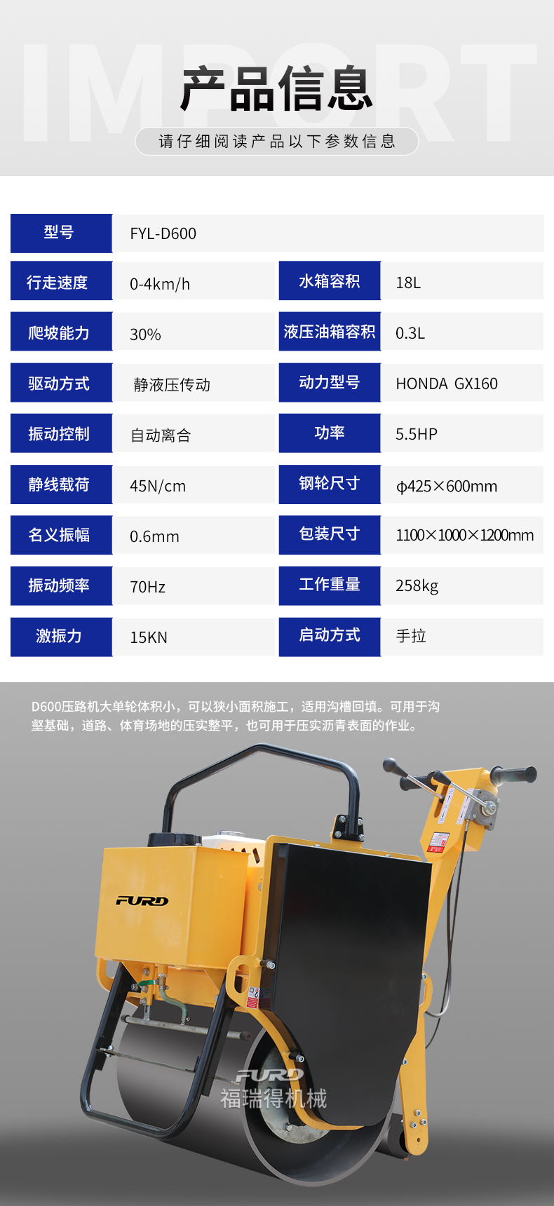 FYL-D600 小型手扶单轮压路机