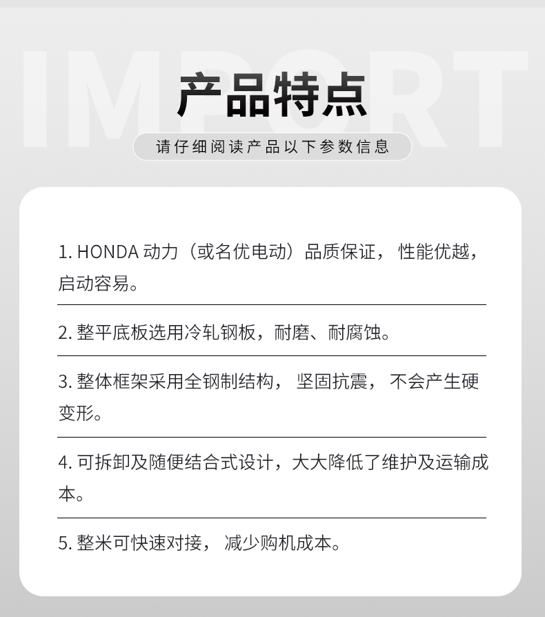 用于混凝土地面的提浆、压实、整平、是修建公路、车间、广场、现代化厂房的新型设备。是传统摊铺机的升级换代产品,汽油机动力及电动机可任意选择。