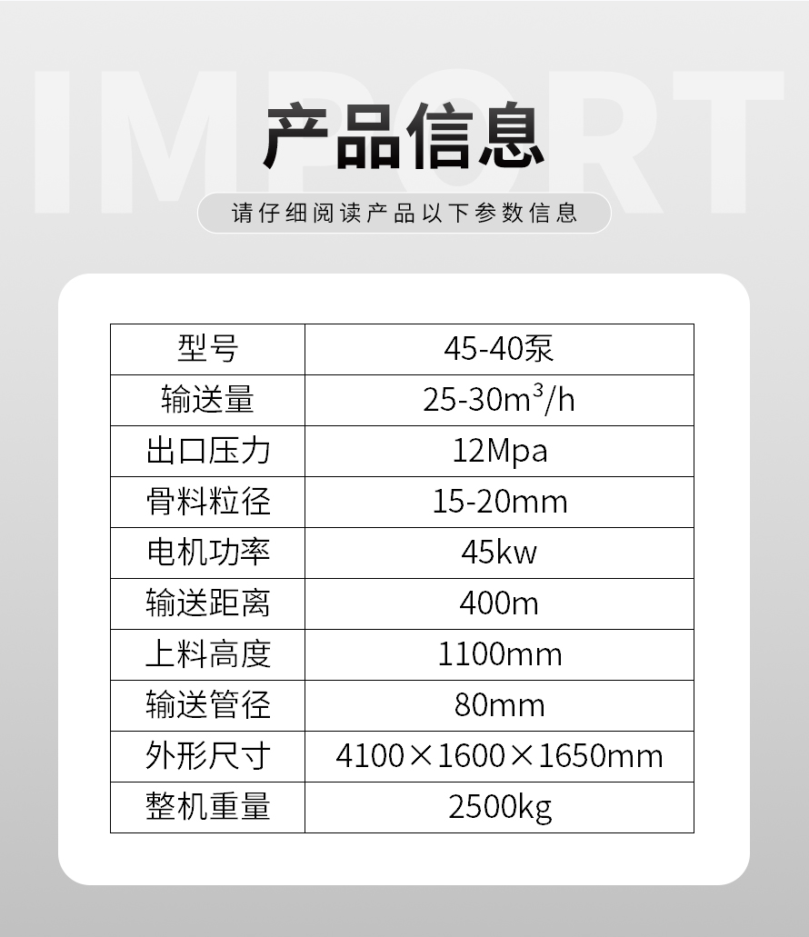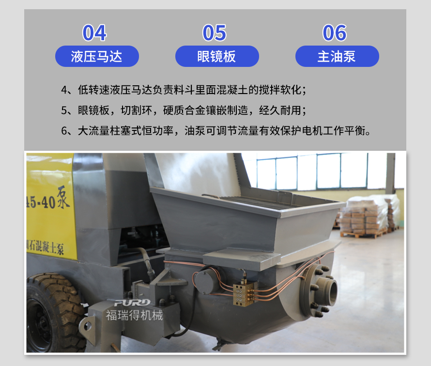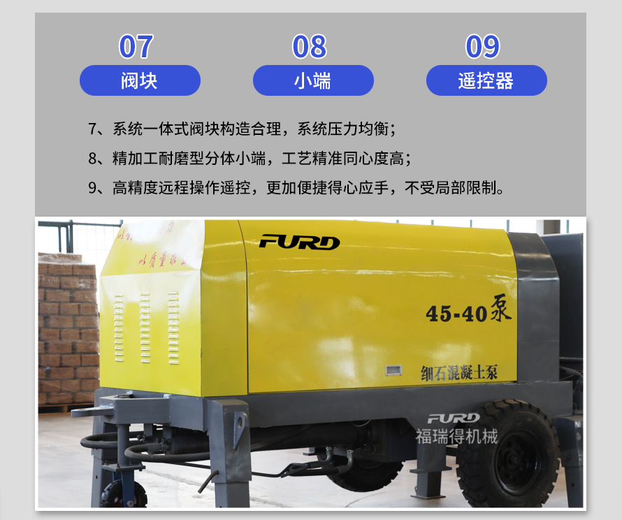 产品介绍: 1,大流量 采用加粗料缸,让机械每一次循环出料多20% 2,效率高 移动便捷全部采用快接式管道卡,提高工作效率 3,便捷 本机可远程遥控,操作不受地点限制,更加人性化 产品用途: 坡道灌浆,水平地面,隧道浇筑,模