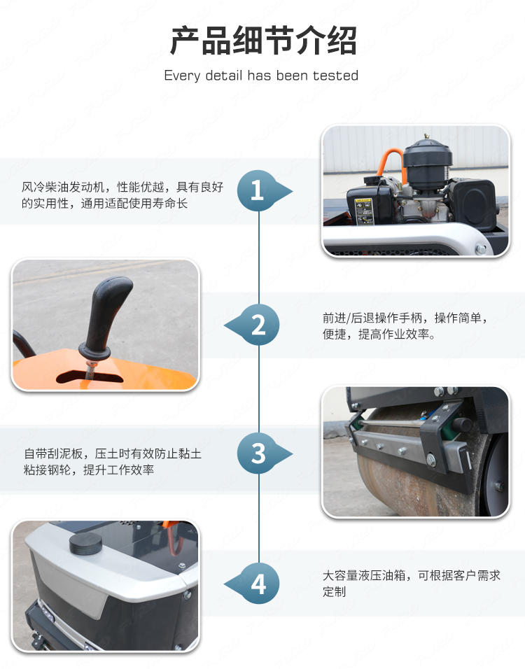 FYLJ-S600P压路机是一种小型振动压路机,适用于修补和养护各种道路,高速公路路肩,路边步行,停车区,运动场和花园草坪,特别适用于狭窄区域的压实,如管道通道和排水沟等