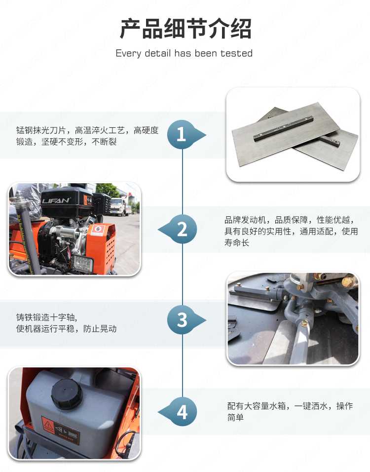 该机采用双刀片,重量更重,对地面的压实效果更好,比走后式动力泥铲机效率更高。