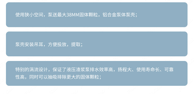 使用狭小空间,泵送最大38mm固体颗粒,铝合金泵体泵壳